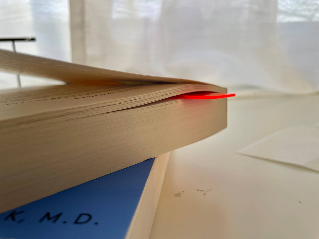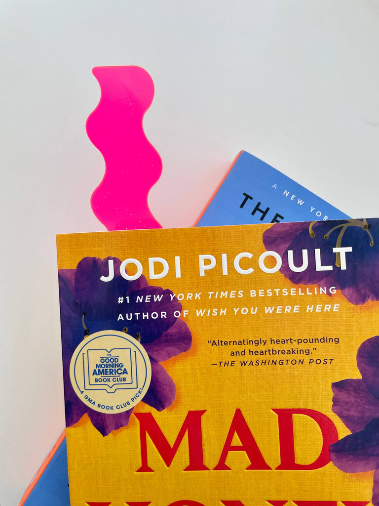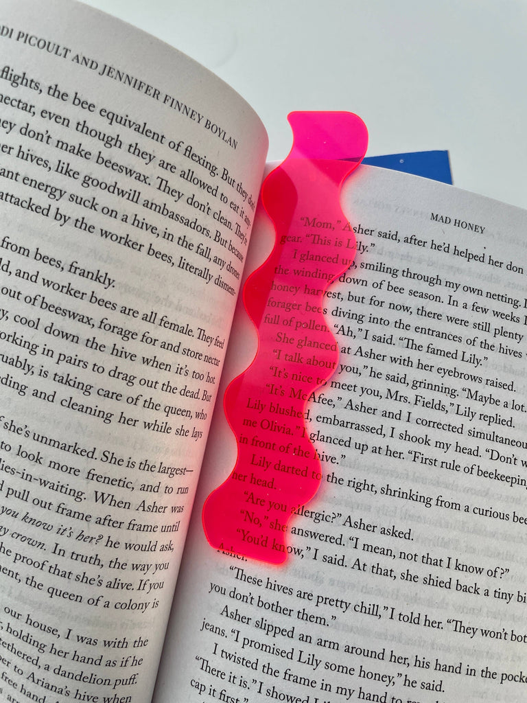 This fun bookmark is made with premium neon pink acrylic - the wavy/squiggle shape is hand drawn and laser cut in my home studio. The acrylic is 1/16 inch, making it the perfect thickness to stay within the pages without being bulky.