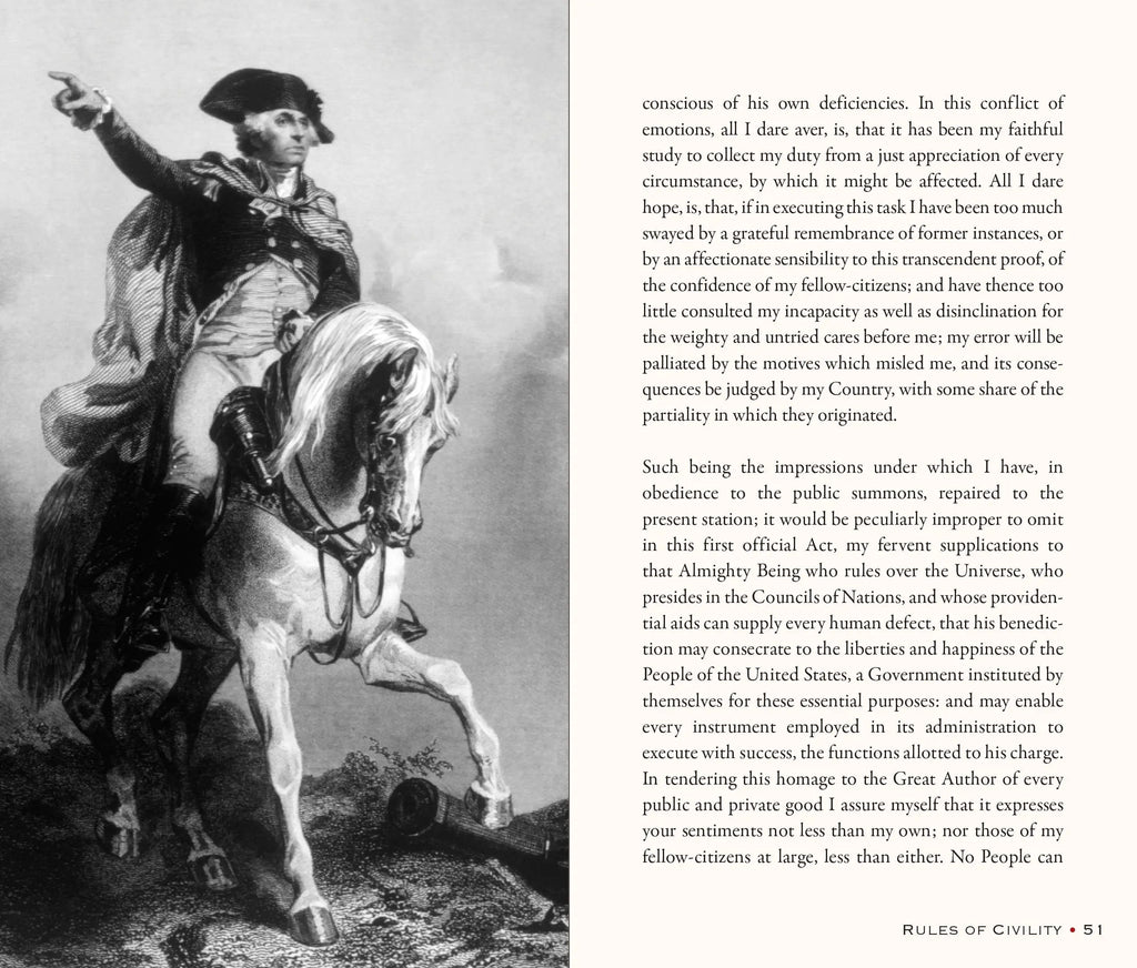 Treasure two essential legacies of history: Beautiful keepsake volume combines George Washington's 110 timeless rules for etiquette, and his seminal first inaugural address as the nation's leader. The instructions for living, transcribed by Washington in his youth, reflect the moral compass and societal norms that shaped his journey through life and leadership, at home, in the battlefield, and in the presidency. Elegant gift edition features embossed covers with hand-selected gold foil decorations. Each turn of the page is accentuated by gilded-gold edges that catch the light. Preserving history: Printed on premium acid-free archival-quality paper for longevity. Designed for portability: Compact volume measures 4-1/2'' wide x 7-1/2'' high. 56 pages encapsulate the essence of Washington's principles for living. An indispensable addition to any personal or professional library. George Washington (1732-1799)