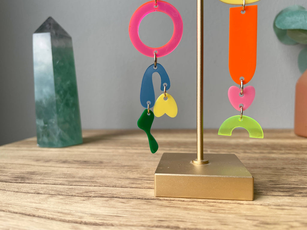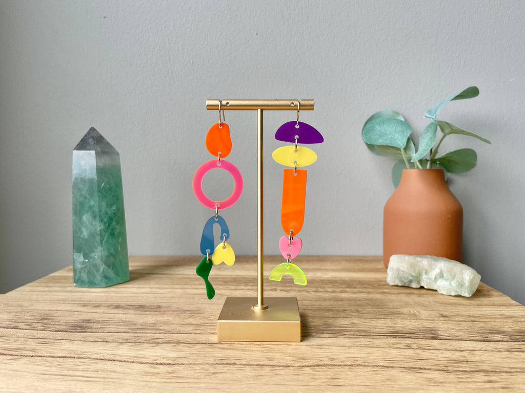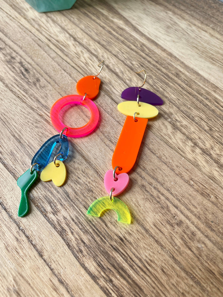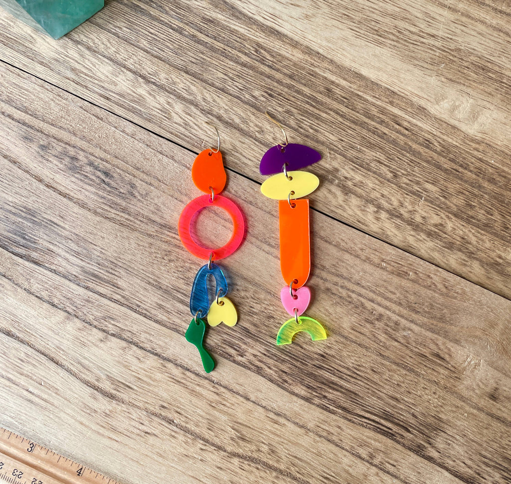 The components of the earrings are hand-drawn and laser cut in my home studio. They are made of premium yellow, orange, blue, neon green, purple, neon pink, pink, and green cast acrylic and attached to stainless steel ear wires.