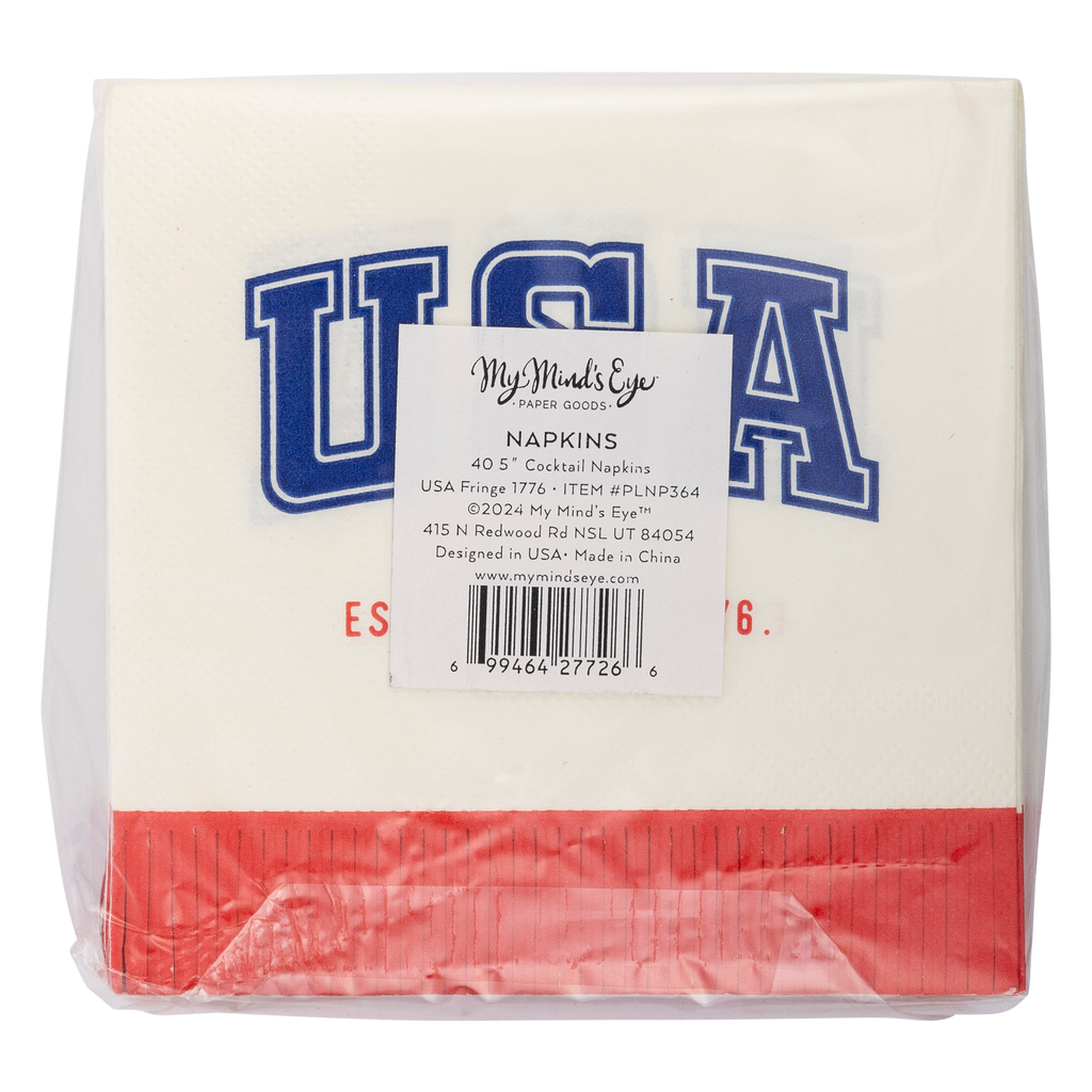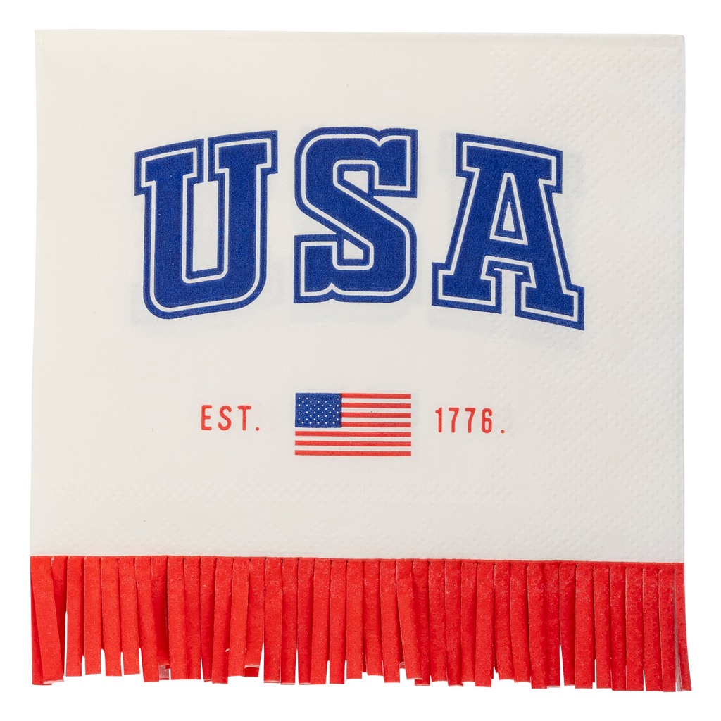 Celebrate in style with our USA Fringe 1776 Paper Cocktail Napkin! This playful napkin features a unique fringe design and proudly displays the USA flag. Perfect for any patriotic occasion, add some fun and flair to your party with our USA-themed napkin. • includes 40 fringed paper napkins • 5" x 5"