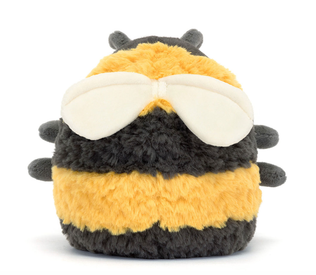 Albee Bee is the happiest little bumble. In thick yellow and black striped fur with little charcoal legs, Albee has a matching face with curved antennae. With a big, stitched smile and soft cream wings, Albee spreads springtime joy all year long!