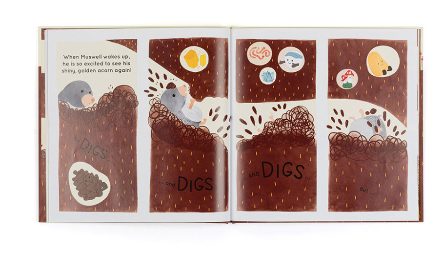 Moles love to DIG and DIG and DIG for treasure! And when they find treasure, they ALWAYS share it. One day, Muswell Mole finds the most beautiful piece of treasure he’s ever seen… a shiny, golden acorn. It’s so beautiful, he decides to keep it all for himself. Will Muswell put things right and learn to share? A quirky story about honesty and kindness, with a large lift-the-flap finale.