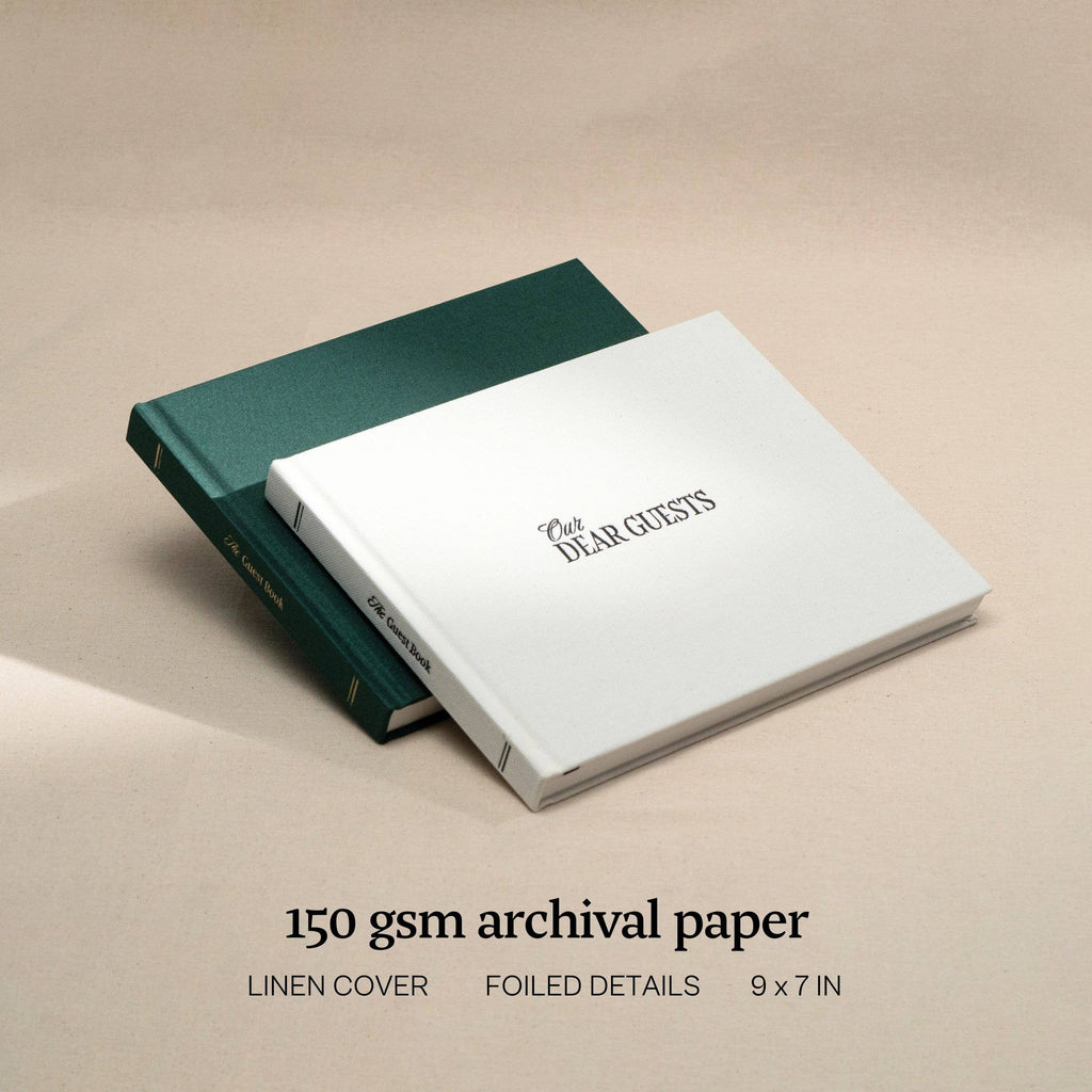 This beautifully crafted guest book features a durable hardcover of high-quality linen with elegant foil embossing, giving it a timeless, sophisticated feel.