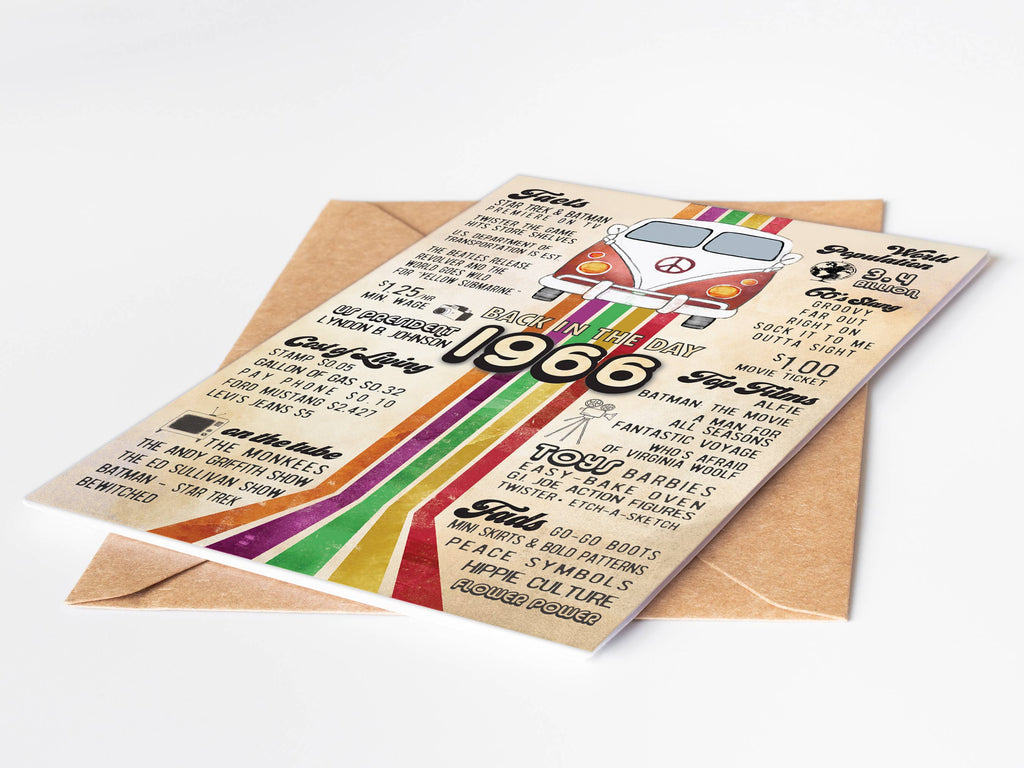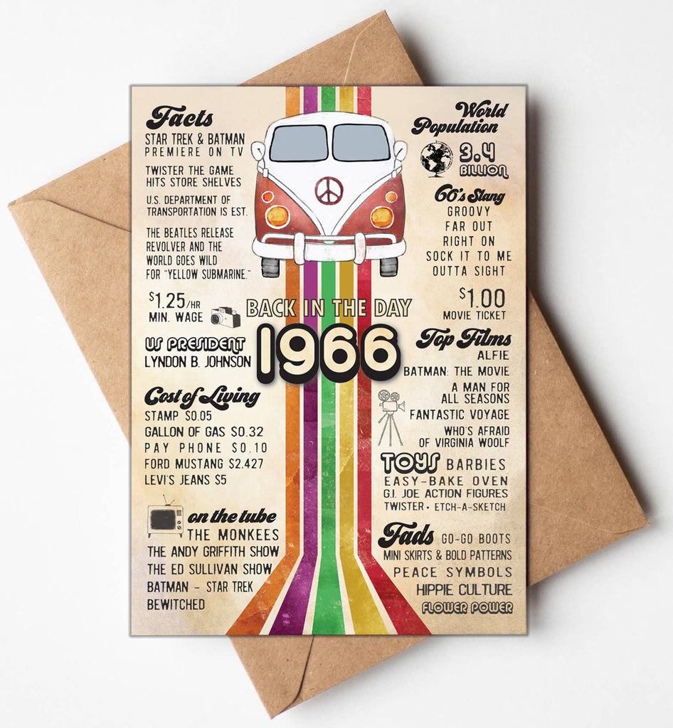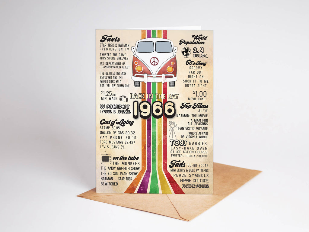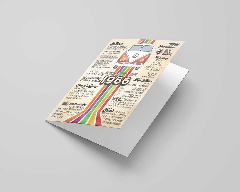 60th birthday with these vintage-inspired retro greeting cards and birthday cards featuring Katie Doodle's iconic 1966 "Back in the Day" design, showcasing a charming retro camper van illustration, bold rainbow accent stripes, and curated fun facts from the mid-1960s including Beatles mania, classic TV shows, flower power, peace symbols, slang, toys, fashion trends, and prices that spark nostalgia and meaningful conversation.