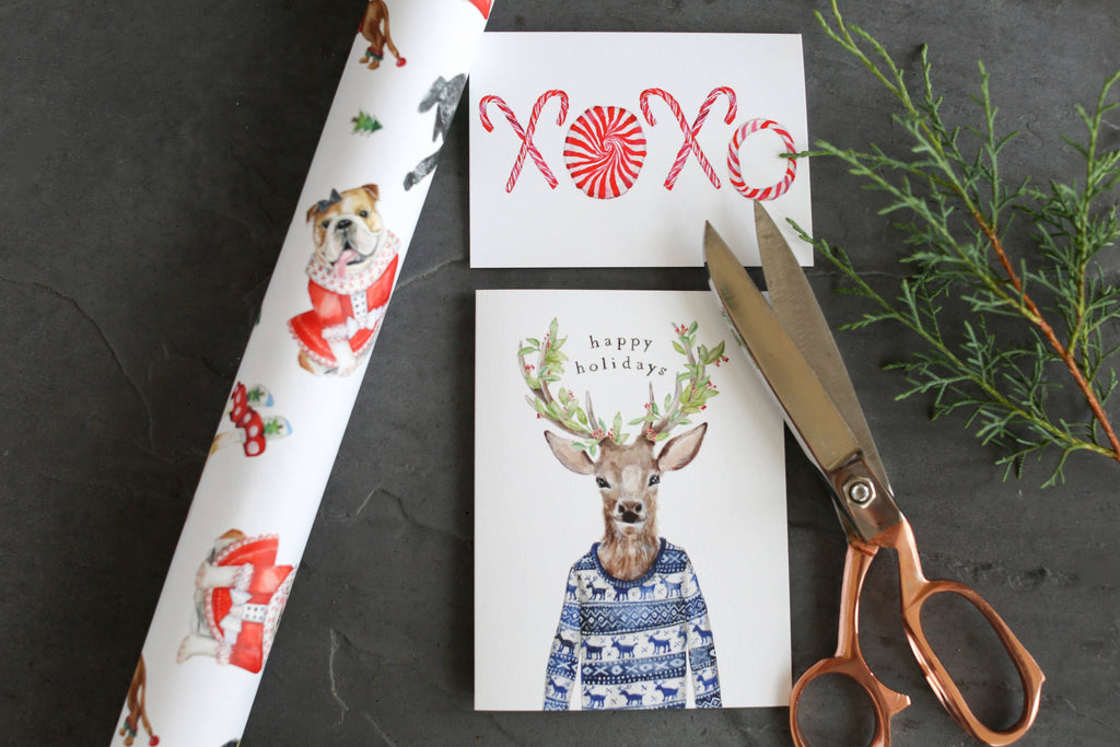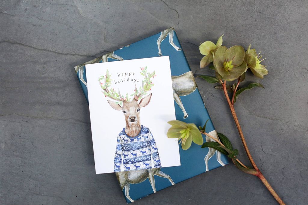Festive holiday card featuring hand-lettering and a hand-illustrated reindeer in a reindeer sweater.