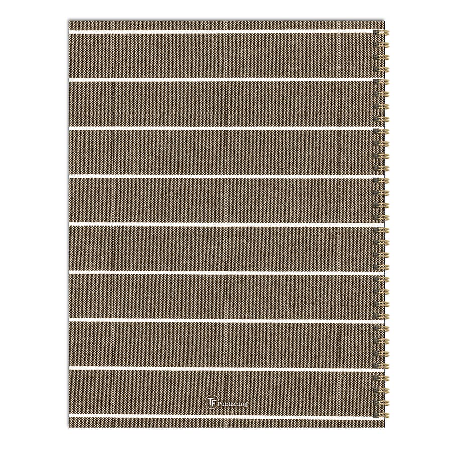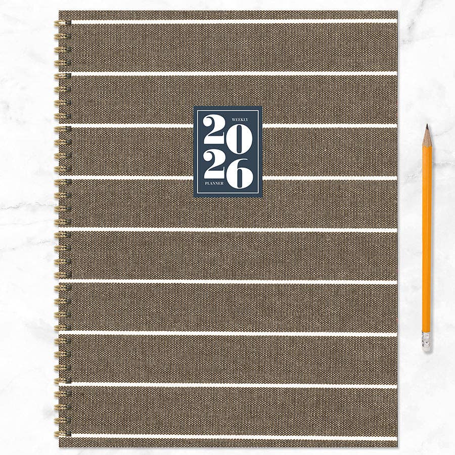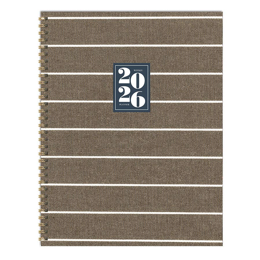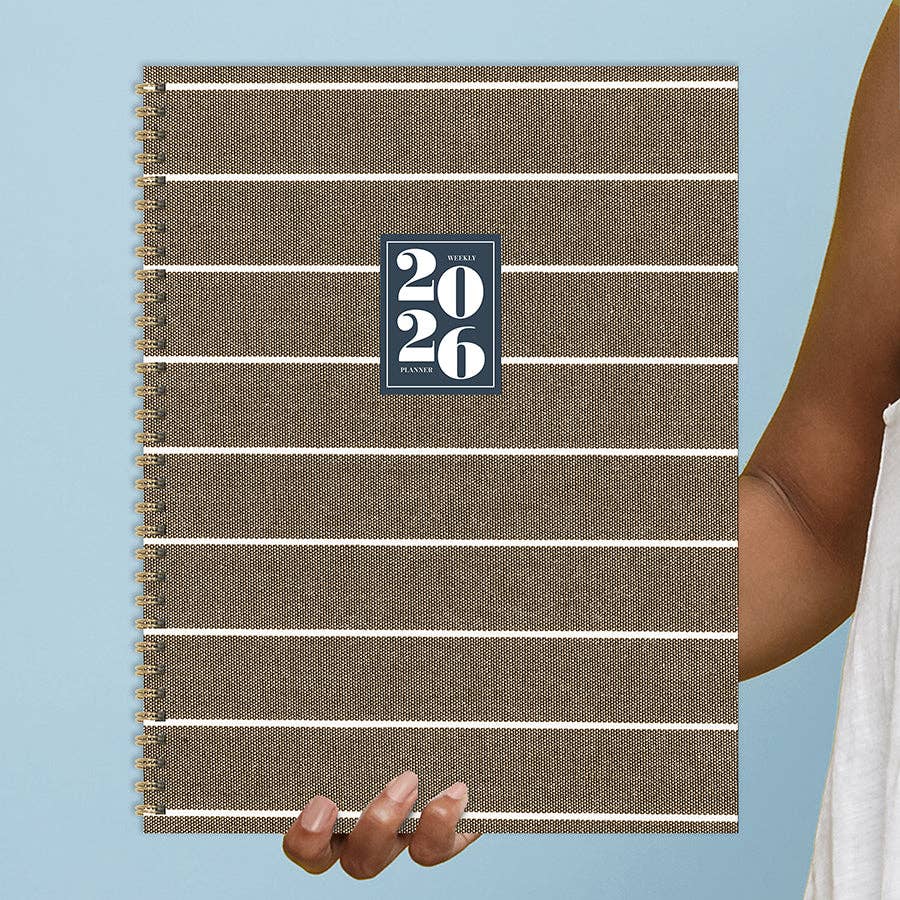 Keep your plans in line with our large, 9" (w) x 11" (h) weekly/monthly planner featuring a striped linen cover design and boasts monthly, 2-page calendar grid overview pages with space to write tasks and highlights. Weekly, 2-page spreads provide plenty of planning space. Interior planning pages are accented with muted colors and faux monthly tabs for easy access to weekly planning. Bonus lined notes pages are in the back and yearly 2026 and 2027 views are included in the front. The monthly boxes measure 1.1" (w) x 1.9" (h). The planner has a durable cover and gold wire-o binding to lay flat when open and includes 368 color coordinating stickers. This 12-month planner covers the months of January 2026 - December 2026 and contains no plastic. Printed on FSC-certified paper.