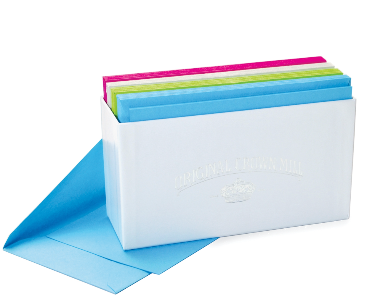 The white stand-up storage box with a silver foil Original Crown Mill seal contains 8 sets each of 4 colors per box in the very useful 3.5x5" flat card size. Color vellum assortments invite mixing and matching of colors. The generous variety of color assortment sets should please every personality.