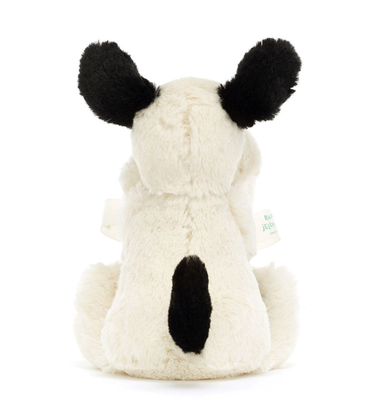 Cuddle up with Bashful Rufferty Black & Cream Puppy Soother; our most loved monochrome pup with adorably perky ears and cheeky smile holding onto an un-stuffed and irresistibly soft, square shaped soother, all made from recycled fibres. Neatly rolled and presented with a Baby Jellycat grosgrain ribbon; destined to be a lifelong companion. Pairs well with this adorable book!