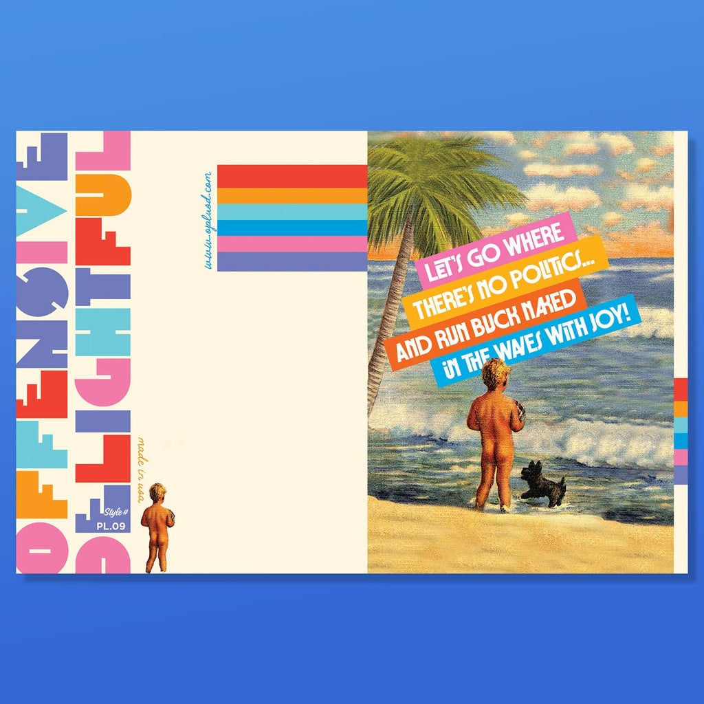 "Let's go where there are no politics, and we can run in the waves buck naked with joy!" NO MORE POLITICS please! Finally a card that says what most of us want, just a joyful life without the clusterf*k that is our government. Even so, it's just a way to make fun of our difficult times, and how over or underinvolved we are. Basking in the waves with no care in the world, like kids.