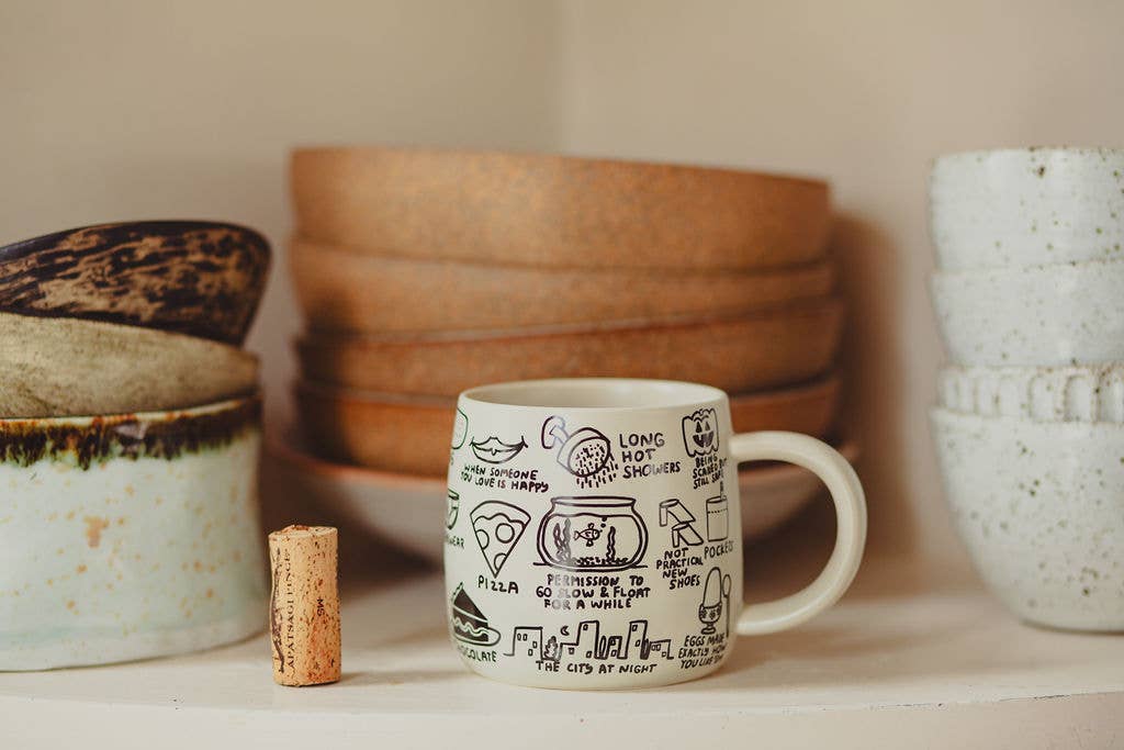 Ceramic mug. Microwave and dishwasher safe. Holds 12 oz.