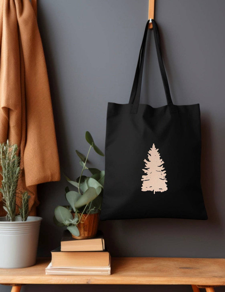 This listing is for 1 small black cotton tote bag. Bag is small. Lightweight. Christmas Tree is a cream/tan plastisol ink heat transfer decal. Digital photo is enlarged to show representation of decal. Not customizable. Approximate Size: •8.5” x 8” Due to handmade nature of this item, not all decals will look exactly as shown in the photos. No items used in the styling of these photos is included in the sale. Not returnable.