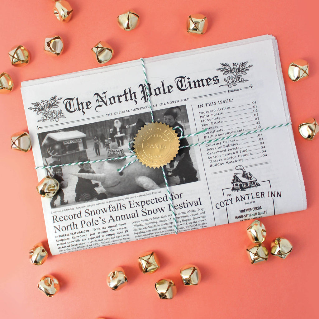 Our new edition for 2025 is here! This adorable novelty newspaper doubles as a Christmas activity, and is sure to become a holiday tradition for your customers. The North Pole Times is filled with fictional articles, activities, ads and more to explore! Package includes four full double-sided sheets on real newsprint. Use them for wrapping gifts, a holiday activity, stocking-stuffers, a Christmas Elf activity, or something that Santa leaves behind on Christmas Eve! The North Pole Times can also be used for Christmas décor on the mantel!