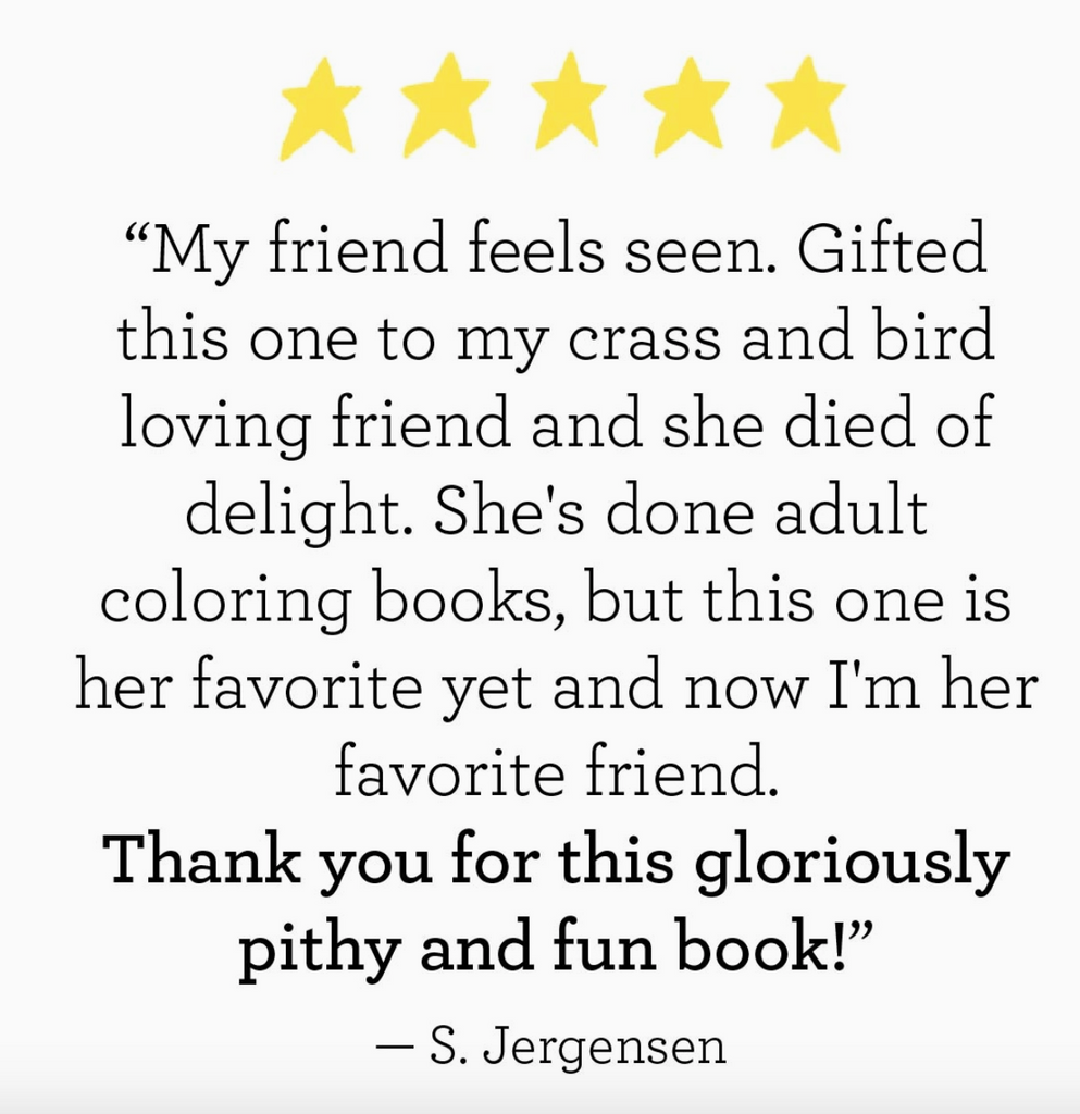 This book is the ULTIMATE in stress relief as you combine coloring with off-color humor. Each page also features a joke that plays off the name of the bird.